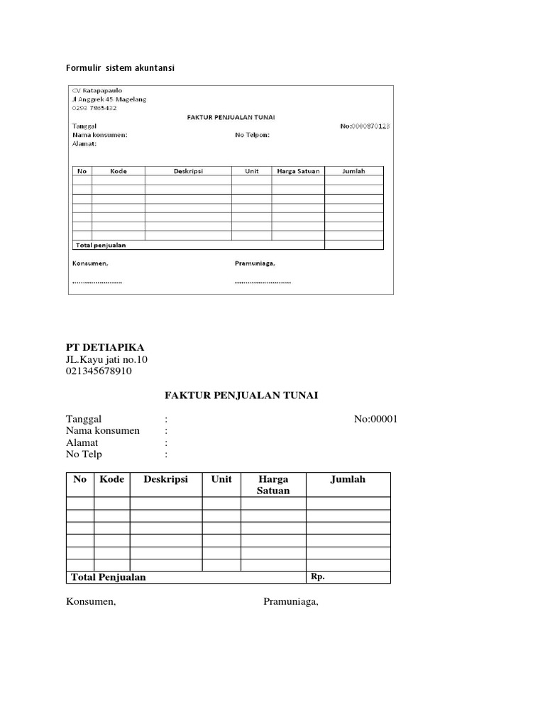 Fungsi dan contoh faktur dalam excel Nota terbagi menjadi dua, yakni nota debit dan nota kredit. Contoh faktur penjualan software zahir accounting sains komputer gambar pengikut. Faktur merupakan dokumen bukti adanya transaksi yang berisi keterangan mengenai pemesanan, seperti alamat, nama, tanggal, nomor pemesanan, rincian barang yang dipesan, sampai total harga. Dalam faktur penjualan pada gambar 1, syarat pembayaran adalah 2/10, n/30 artinya diskon tunai 2 persen atas harga faktur, dikurangi dengan retur atau potongan, akan diperoleh jika melakukan pembayaran dalam jangka waktu 10 hari dari tanggal faktur. Contoh faktur penjualan tunai ini digunakan sebagai bukti sebuah transaksi. Faktur merupakan suatu perhitungan penjualan kredit yang diberikan oleh penjual kepada pembeli atau konsumen. Preview contoh faktur penjualan tunai dalam format excel. Dalam bahasa inggris, faktur penjualan dikenal dengan nama. Salah satu contoh faktur penjualan barang adalah penjualan buku dan alat tulis kepada distributor alat tulis. Nota toko komputer contoh normalisasi. Ukuran nota di atas adalah beberapa contoh yang sering digunakan di masyarakat. Dari transaksi tersebut baik itu pembelian yang dilakukan secara tunai maupun secara kredit, tentu akan memerlukan faktur sebagai bukti transaksinya.