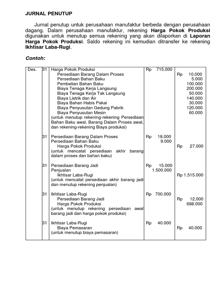 Contoh jurnal penutup perusahaan manufaktur sebenarnya jurnal penutup dari perusahaan manufaktur pun tak jauh berbeda dengan jurnal penutup pada perusahaan dagang.