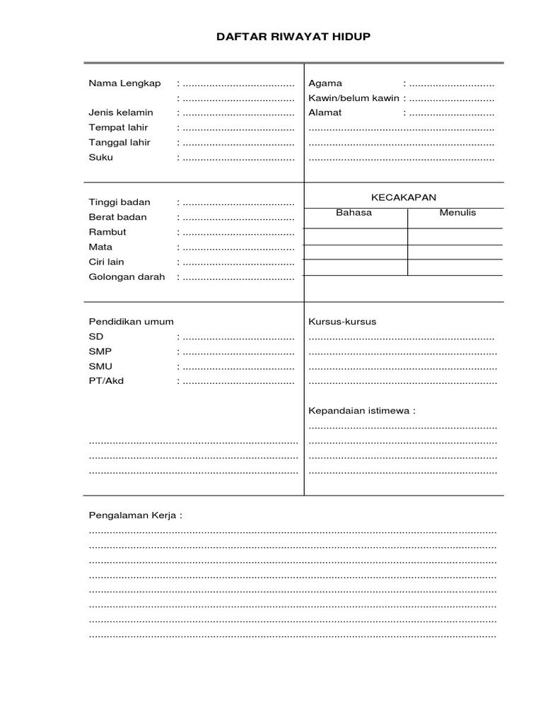 Di sini akan dibahas contoh daftar riwayat hidup yang lengkap dengan bahasa indonesia dan bahasa inggris. A short summary of this paper. Dalam contoh daftar riwayat hidup tni ad , gawe cv telah memilihkan tema atau template yang terbaik untuk dijadikan inspirasi, ide ataupun acuan dalam penulisan surat anda. 4 contoh daftar riwayat hidup tni ad contoh miri cuitan dokter doc; Riwayat hidup singkat tni ad.